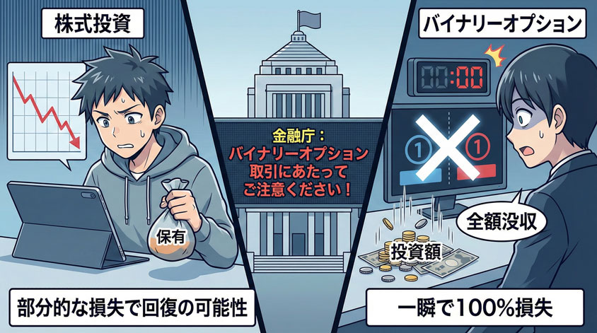 リスクの「種類」が異なるため、単純比較は難しいです。バイナリーオプションは1回の取引で投資額の100%を失いますが、それ以上の損失はありません。一方FXは、レバレッジにより投資額を超える損失(追証)が発生する可能性があります。ただし、FXは損切りや利確のタイミングを自分でコントロールできるため、リスク管理の自由度はFXの方が高いと言えます。
